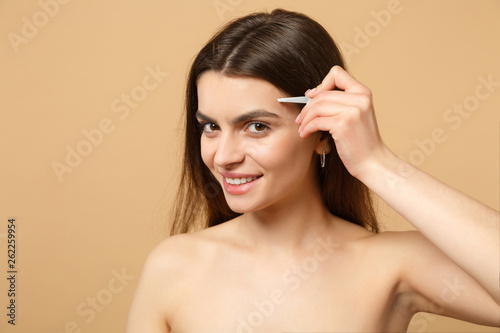 © ViDi Studio, Fototapeta premium Close up brunette half naked woman 20s with perfect skin, nude make up isolated on beige pastel wall background, studio portrait. Skin care healthcare cosmetic procedures concept. Mock up copy space.