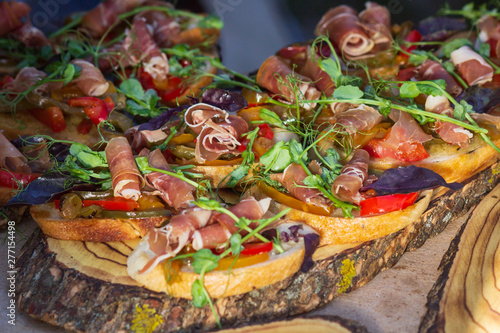 Fototapeta premium Close up bruschetta with proschuto, tomato, parmesan cheese and arugula