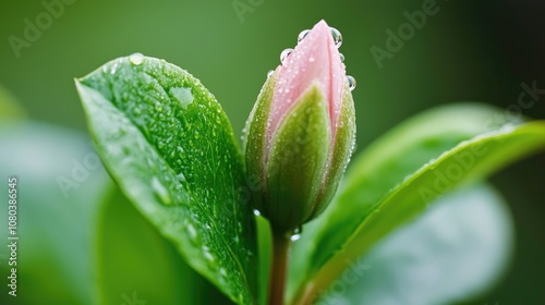 Fototapeta premium Close-Up Capture of a Budding Flower with Dew Drops on Green Leaves,...