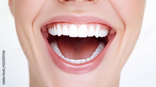 © olga_demina, Obraz premium Close up capturing a perfect smile, showcasing white, healthy teeth and radiating happiness. Emphasizing the importance of dental care and oral hygiene for overall well being