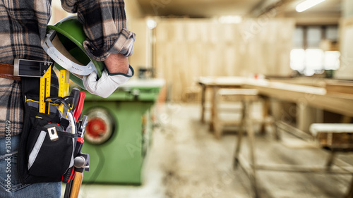 © francescomou, Fototapeta premium Close-up. Carpenter with his hands protected by gloves holds the helmet. Construction industry, carpentry workshop.