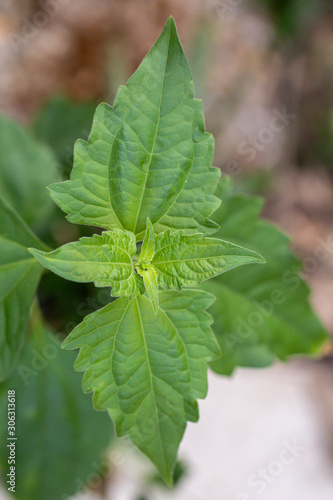 © alohapatty, Naklejka premium Close up Chromolaena odorata leaf.Common names include Siam weed,Christmas bush,devil weed, common floss flower.
