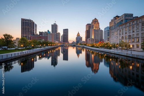 Naklejka premium Close up, City skyline reflected in calm river at dusk