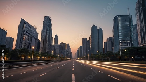 © Robiul, Fototapeta premium Close up clean empty road on modern office of city building buildings