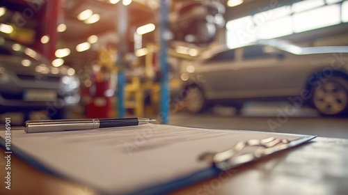 Obraz premium Close-up clipboard pen top it is resting wooden A view