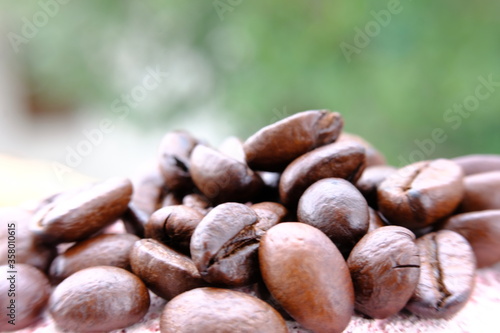 © WS Studio 1985, Fototapeta premium close up coffee beans on wood table and macro coffee beans background