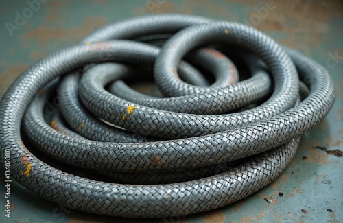 © Maryna, Obraz premium Close-up coiled stainless steel braided flex hose industrial plumbing detail. Metallic gray color. Heavy duty industrial equipment, chemical transportation, fluid flow, engineering tech background.