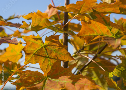 © Kristyna, Obraz premium close up colorful bright orange maple tree autumn leaves on blue sky background