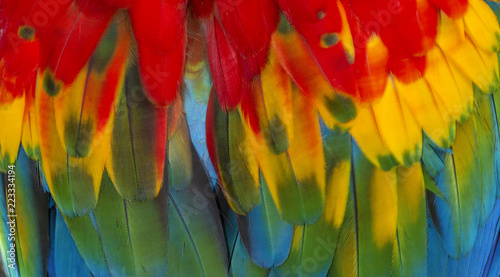 Fototapeta premium Close up Colorful of Scarlet macaw bird's feathers with red yellow orange and...