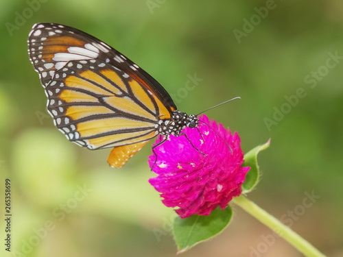 © Yuttana Joe, Fototapeta premium Close-up Common Tiger (Danaus genutia), beautiful orange, white and black color pattern wing, Monarch butterfly feeding on pink flower with natural blurred background, Thailand.