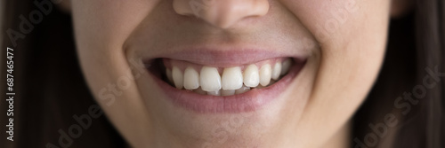 © fizkes, Fototapeta premium Close up cropped lower part of face, beautiful young woman having wide toothy smile advertising dental clinic, professional procedures, satisfied client patient promoting dentist services, braces ad
