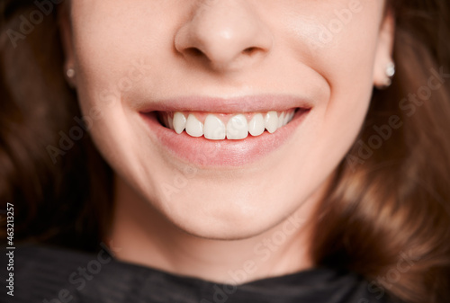 Fototapeta premium Close-up, cropped snapshot of beautiful healthy female smile. Front view....