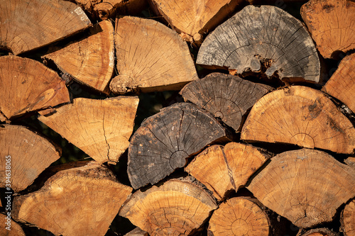 © Semachkovsky , Naklejka premium Close up. Cut down tree trunks on a pile in a forest. Circles of the tree. Old branches.