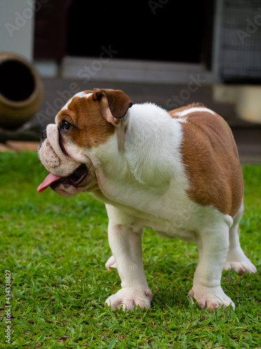 © Apinut, Obraz premium close up cute brown female English bulldog puppies playing outdoors