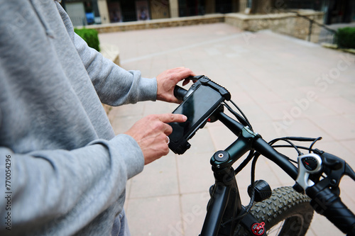 © Taras Grebinets, Obraz premium Close-up cyclist checks mobile app on smartphone Mockup digital touch screen, setting up a route on internet online map