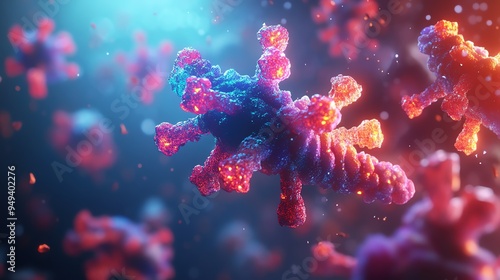 Fototapeta premium Close-up 3D illustration of antibodies attacking diseased cells under a...