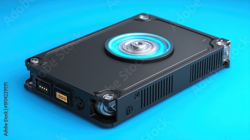 © A4719, Fototapeta premium Close up 3d render of a black hard drive with glowing blue light on a solid blue background studio shot.