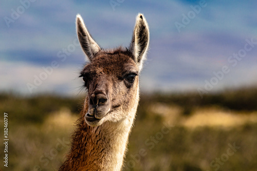 © Madu Oliveira, Obraz premium close-up da cabeça de um guanaco com a boca torta de uma forma engraçada
