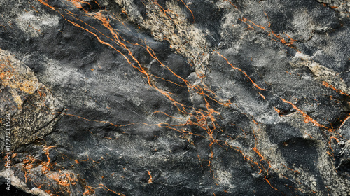 © Vitor, Fototapeta premium Close-up da textura de granito natural em tons escuros com veios alaranjados.
