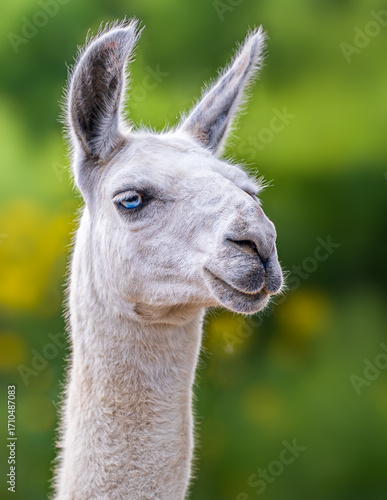 © Yonel, Obraz premium close up de Alpaca blanca en un campo verde mirando hacia un lado