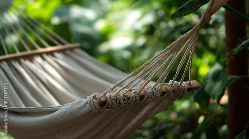 Fototapeta premium Close-up detail of a white cotton hammock hanging in a lush green garden inviting relaxation and leisure.