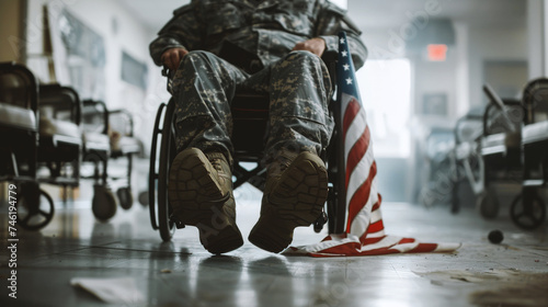 © Tharika, Obraz premium Close-up detail of man prosthetic leg in a wheelchair in a hospital, an American flag draped over his lap, Veterans day concept. Generated-AI