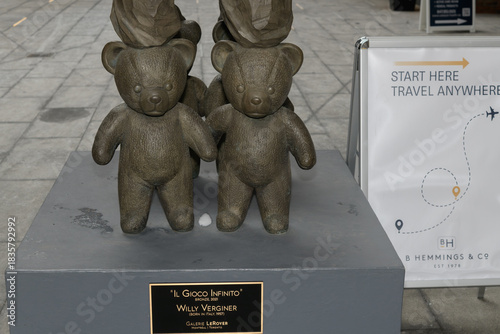 © eugen, Fototapeta premium close-up detail of Willy Verginer’s Il Gioco Infinito (2021) — a bronze and acrylic sculpture exhibited at Galerie LeRoyer and Yorkville Lane in Toronto - teddy bears