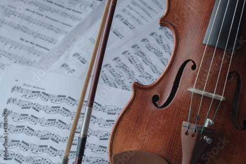 © itsuky, Naklejka premium Close up detail on violin body, bow and music notes background. Classic instrument with copy space area