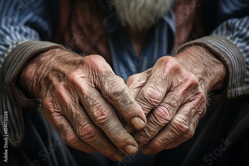 Fototapeta premium Close-up detailed image of weathered hands of an elderly man. Showing the aged skin. Wrinkles. And texture from a lifetime of hard work and manual labor. Reflecting strength. Wisdom