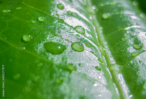 © Albina, Fototapeta premium Close-up Drops of water on Green Leaf surface, close-up rain drop on banana leaf background.