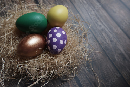 © Supitnan, Obraz premium Close up Easter eggs on wooden table.