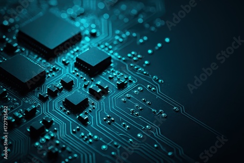Obraz premium Close up electronic circuit board with microchips pathways and solder points teal glow