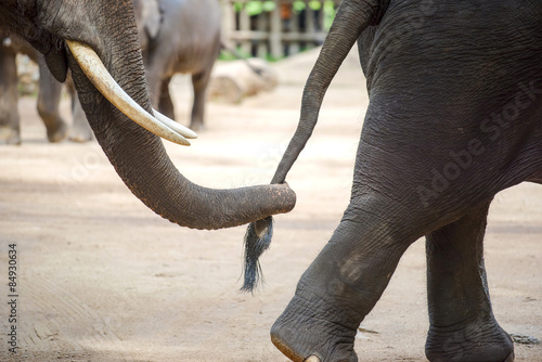 © devilkae, Obraz premium Close up elephant trunk holding the tail of another elephant.