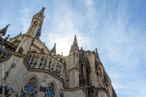 Fototapeta premium Close up exterior view of the ornate medieval Our Lady of Reims Cathedral...