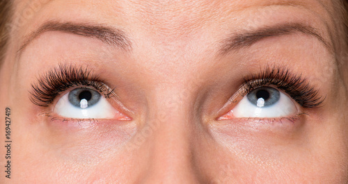 Fototapeta premium Close-up face of beautiful young woman with beautiful blue eyes and big pretty eyelashes and eyebrows. Macro of human eye - open expressive look up.