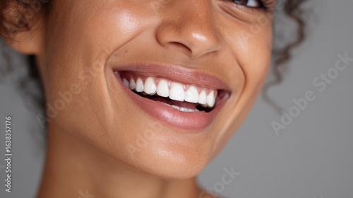 © Johannes, Obraz premium close up face of young woman with beautiful smile isolated on grey wall with copy space successful multiethnic girl latin woman looking at camera against gray wall with a big whitening teeth smile no