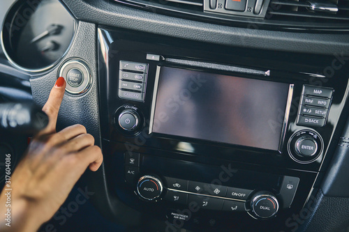 Fototapeta premium Close up female hand touch control panel before purchasing a new automobile...