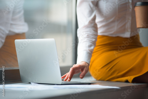 © Yakobchuk Olena, Naklejka premium Close up female hand typing in keypad of modern laptop in office. Occupation and technology concept