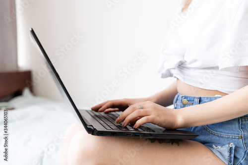 © Andrii Lysenko, Naklejka premium close-up female hands near laptop keyboard. Online shopping concept.