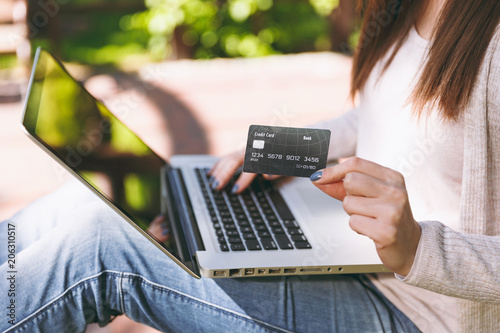 © ViDi Studio, Naklejka premium Close up female hands on keyboard. Woman sitting on bench holding credit card, working on modern laptop pc computer in city park in street outdoors. Mobile Office. Online shopping, business concept.