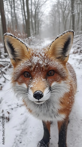 Obraz premium Close up fox face surrounded by snowy forest high resolution picture