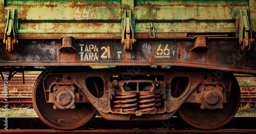 Naklejka premium Close up fragment of old rusty train cargo wagon. Rusty wheels of an old rail...
