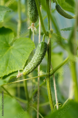 © Vitalii M, Naklejka premium Close up fresh cucumber growing in greenhouse.