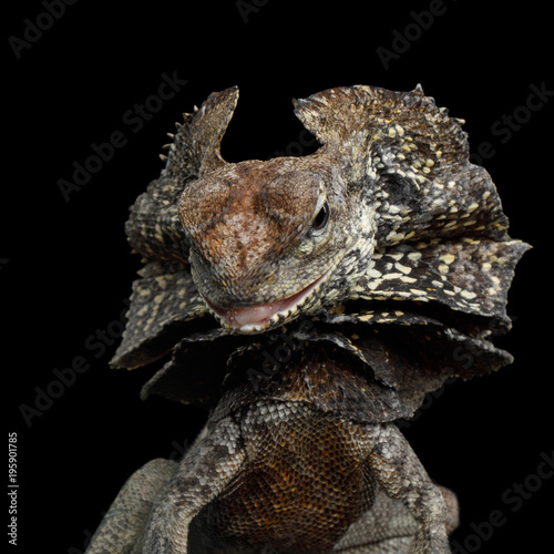 Fototapeta premium Close-up Frill-necked lizard attack, also known as the frilled lizard, Chlamydosaurus kingii, on isolated Black Background