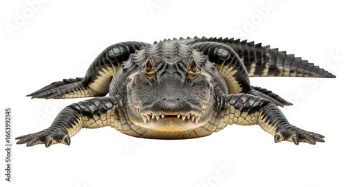© Demas, Naklejka premium Close-up front view of a dangerous American alligator showing its sharp teeth and scaly skin with a dark black background in a studio portrait setting