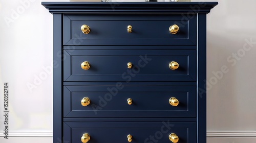 © Gabriel, Fototapeta premium Close-up front view of elegant navy blue chest of drawers with gold handles on white background
