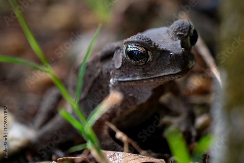 © Denise, Fototapeta premium Close-up garden frog against bokeh background