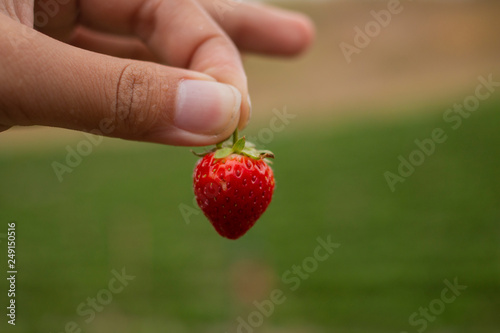 Obraz premium Close up gardener picking the fresh strawberry from the strawberry tree.
