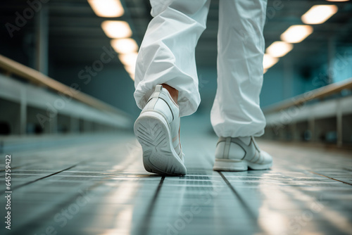Fototapeta premium Close up generative AI image of a man in a lab coat and footwear walking down...
