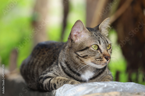 © pumppump, Naklejka premium Close up gray cat house is sit down and rest on the old wall near the garden at thailand